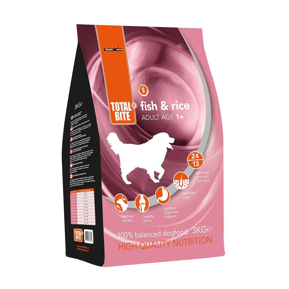 Total Bite Dog Fish & Rice zorgt ervoor dat je hond in een optimale conditie blijft. Het voer is volledig glutenvrij en verlaagt de kans op voedselintolerantie en allergische reacties. Daarnaast bevat dit voer organische sporenelementen. Samen met de eiwitten, mineralen en vetten bieden deze ingrediënten de juiste ondersteuning voor een goede gezondheid.