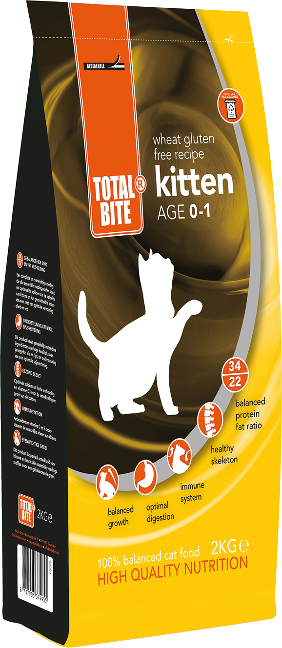 Opgroeiende, actieve kittens kunnen niet zonder de juiste bouwstoffen. Ze gebruiken al hun energie om te groeien. Total Bite Kitten is speciaal ontwikkeld voor katten tot 1 jaar. De brok bevat alle essentiële voedingsstoffen voor een evenwichtige groei. Total Bite Kitten is tevens een goede ondersteuning voor het immuunsysteem, draagt zorg voor een gezonde skeletopbouw en bevordert de spijsvertering. Altijd hét recept voor de opgroeiende kat.