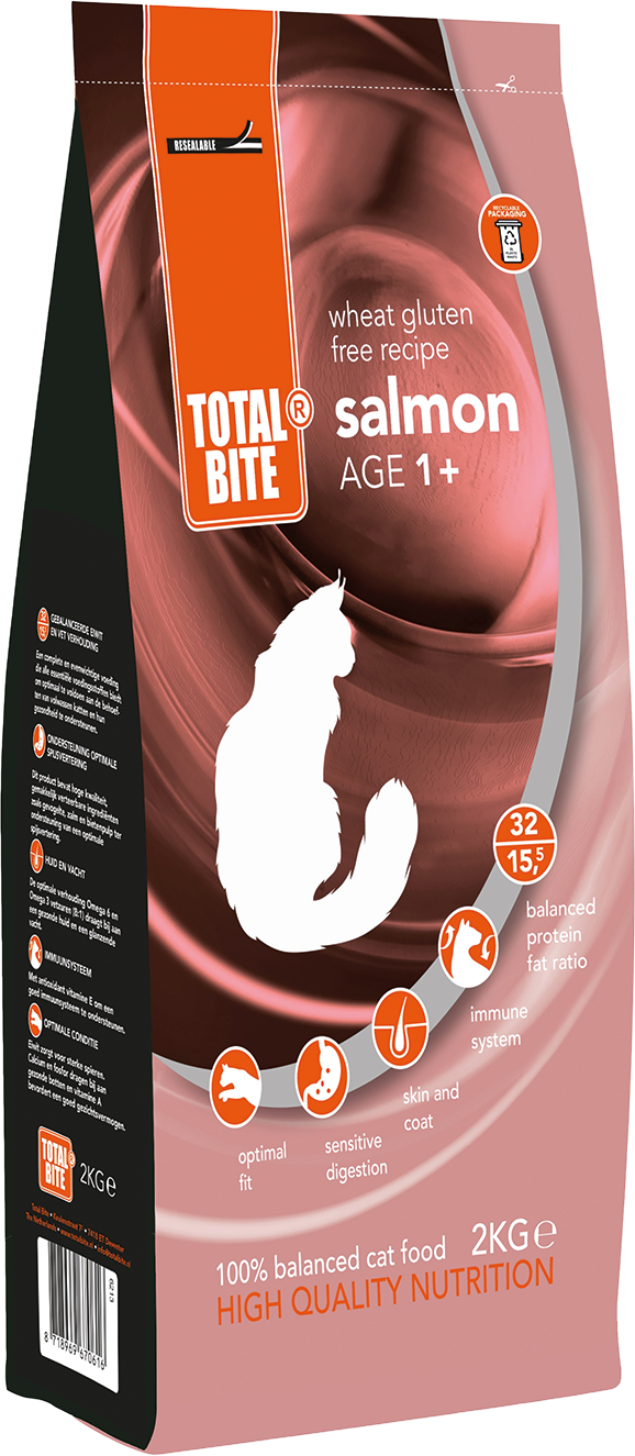 Total Bite Cat Salmon zorgt ervoor dat je kat in een optimale conditie blijft. Deze voeding is speciaal ontwikkeld voor het behoud van een optimale conditie van de volwassen kat. De goede kwaliteit eiwitten ondersteunt een sterke spieropbouw.