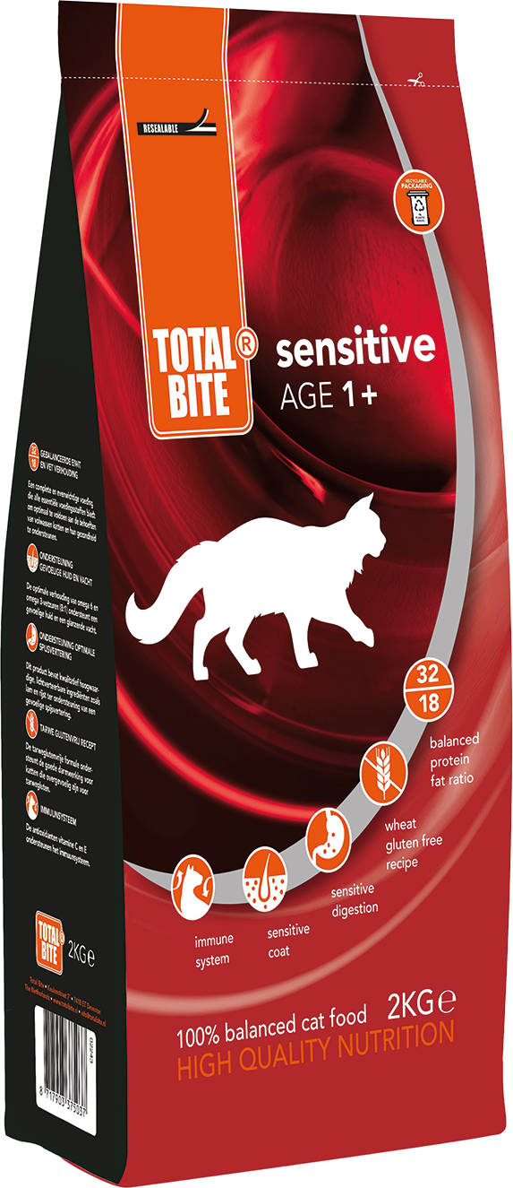 Total Bite Sensitive zorgt ervoor dat je kat in een optimale conditie blijft. Het voer is glutenvrij en de hoogwaardige ingrediënten ondersteunen de spijsvertering en zorgen ervoor dat je kat minder risico loopt op allergische reacties en voedselintolerantie. Bij voedselintolerantie kunnen klachten ontstaan als braken, diarree, verminderende eetlust, gewichtsproblemen, huid- en vachtproblemen, bultjes en jeuk.