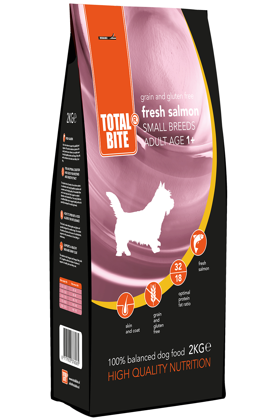 Total Bite Dog Adult Fresh Salmon Small Breeds zorgt ervoor dat je hond in een optimale conditie blijft. Het voer is volledig graan- en glutenvrij. Dankzij de verse toepassing in deze voeding vanuit één dierlijke eiwitbron (verse zalm) loopt je hond minder risico op voedselintolerantie* of een allergische reactie.