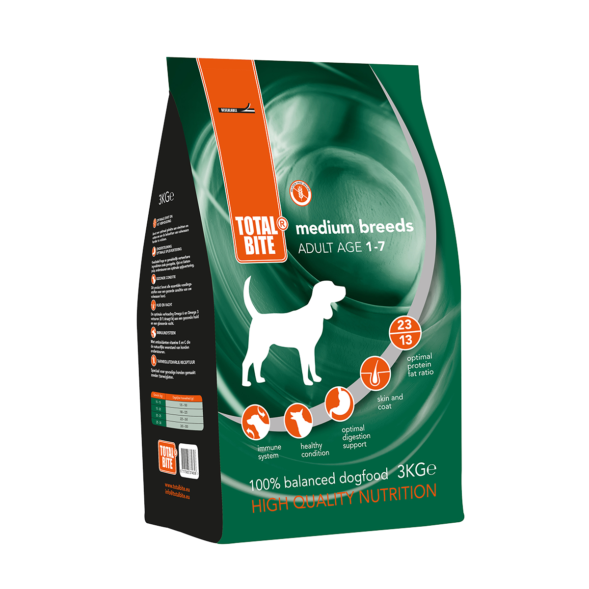 De brokjes bevatten alle bouwstoffen die jouw energieke hond nodig heeft. Total Bite Medium Breeds bevat de juiste verhouding van ingrediënten voor de energiebehoefte van de middelgrote volwassen hond. De licht verteerbare brok bestaat uit gevogelte, rijst, bietenpulp, vetten, vitamines en antioxidanten voor een goede weerstand, een gezonde conditie en een optimale spijsvertering.