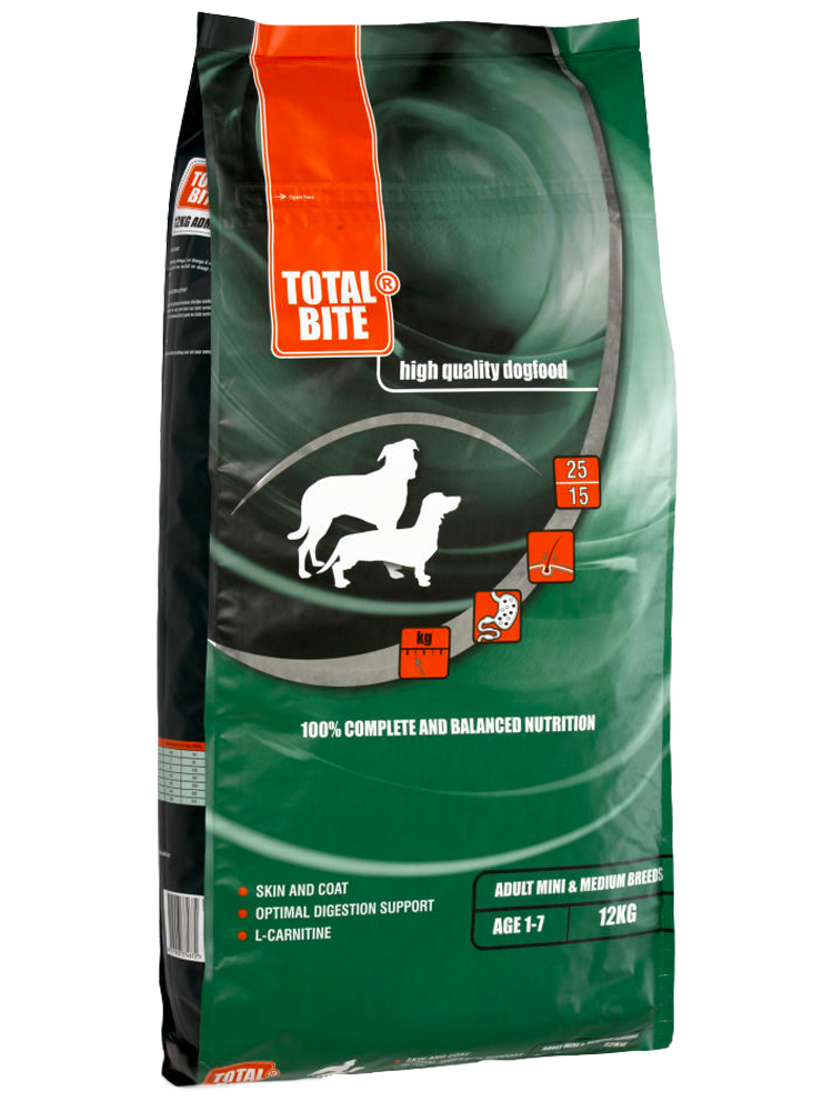 De brokjes bevatten alle bouwstoffen die jouw energieke hond nodig heeft. Total Bite Medium Breeds bevat de juiste verhouding van ingrediënten voor de energiebehoefte van de middelgrote volwassen hond. De licht verteerbare brok bestaat uit gevogelte, rijst, bietenpulp, vetten, vitamines en antioxidanten voor een goede weerstand, een gezonde conditie en een optimale spijsvertering.