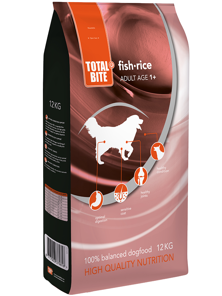 Total Bite Dog Fish & Rice zorgt ervoor dat je hond in een optimale conditie blijft. Het voer is volledig glutenvrij en verlaagt de kans op voedselintolerantie en allergische reacties. Daarnaast bevat dit voer organische sporenelementen. Samen met de eiwitten, mineralen en vetten bieden deze ingrediënten de juiste ondersteuning voor een goede gezondheid.