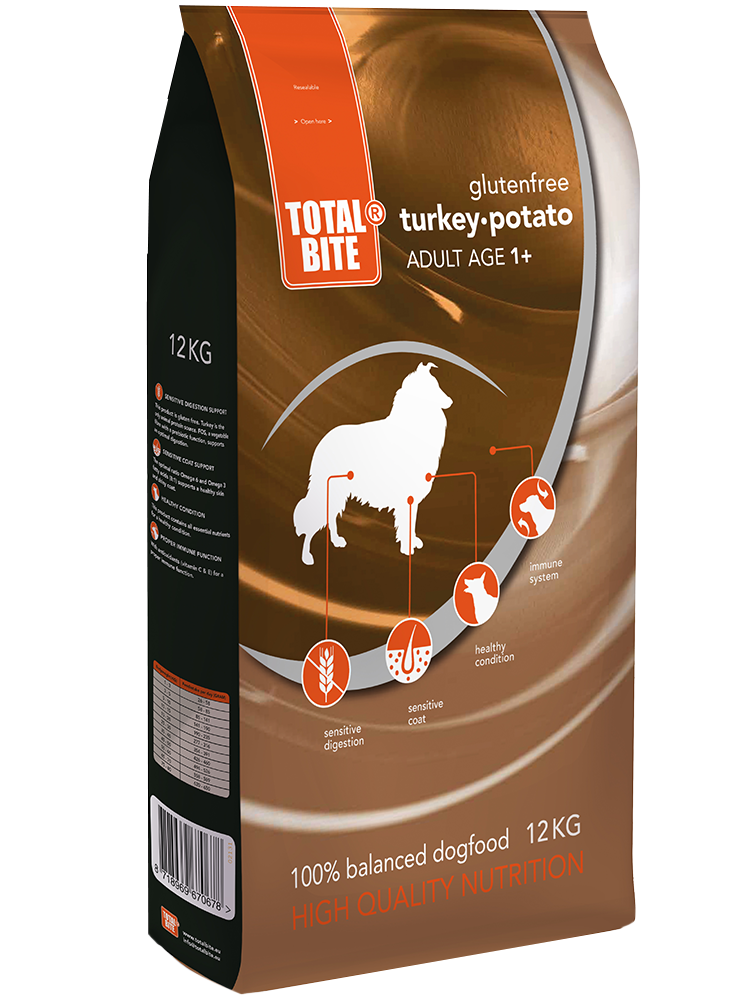 Total Bite Dog Turkey & Potato zorgt ervoor dat je hond in een optimale conditie blijft. Het voer is volledig gluten- en graanvrij en verlaagt de kans op voedselintolerantie en allergische reacties. Daarnaast is dit voer ideaal voor honden met een gevoelige maag (graanvrij). De aanwezige Yucca helpt om de darmen te reinigen, waardoor de ontlasting minder stinkt.