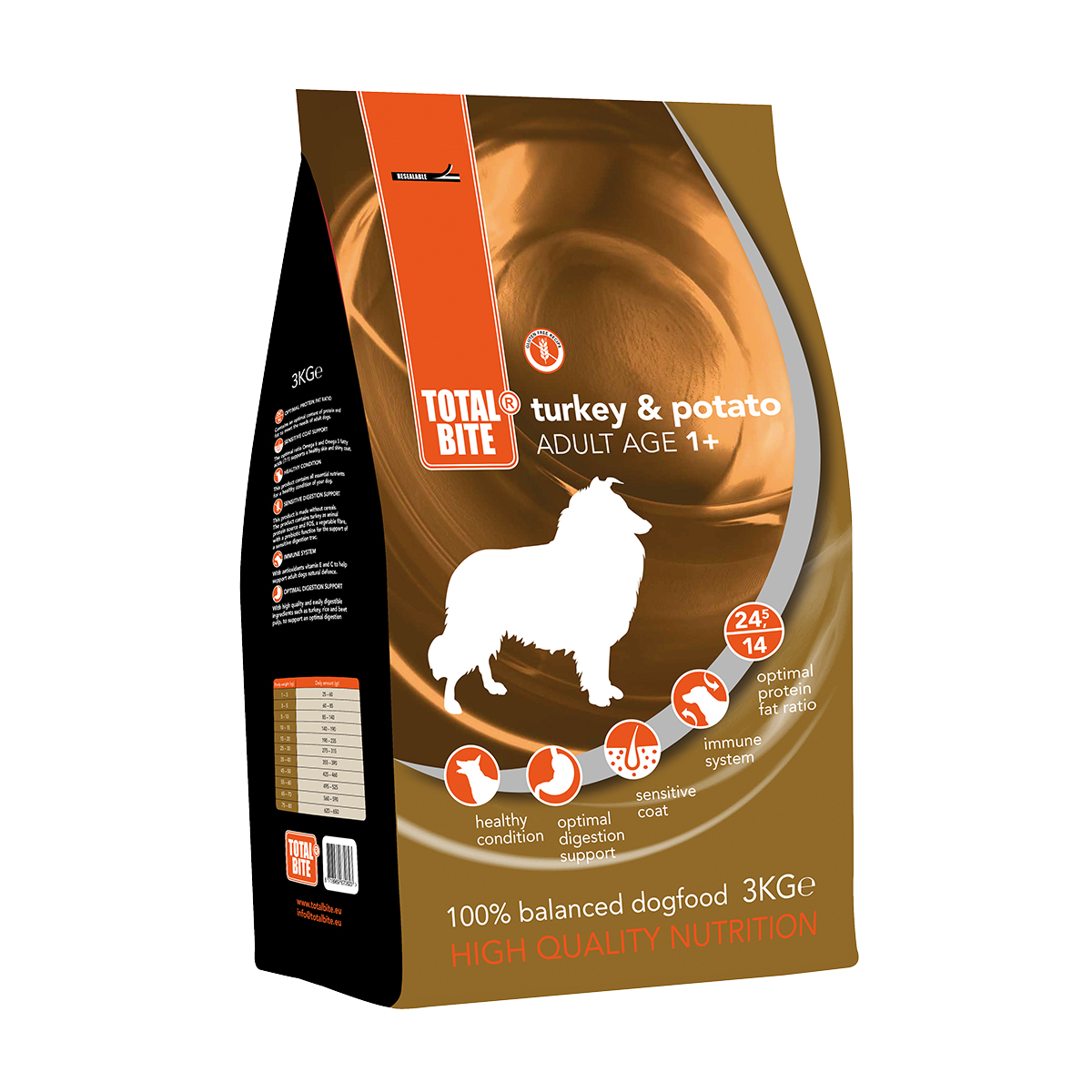 Total Bite Dog Turkey & Potato zorgt ervoor dat je hond in een optimale conditie blijft. Het voer is volledig gluten- en graanvrij en verlaagt de kans op voedselintolerantie en allergische reacties. Daarnaast is dit voer ideaal voor honden met een gevoelige maag (graanvrij). De aanwezige Yucca helpt om de darmen te reinigen, waardoor de ontlasting minder stinkt.