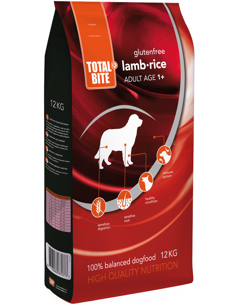 Total Bite Dog Lamb & Rice zorgt ervoor dat je hond in een optimale conditie blijft. Het voer is volledig glutenvrij en verlaagt de kans op voedselintolerantie en allergische reacties. Daarnaast bevat dit voer organische sporenelementen. Samen met de eiwitten, mineralen en vetten bieden deze ingrediënten de juiste ondersteuning voor een goede gezondheid.