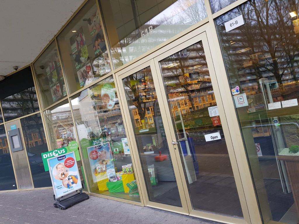 Gratis parkeren kan op het parkeerterrein voor de winkel of in de parkeergarage boven het winkelcentrum.